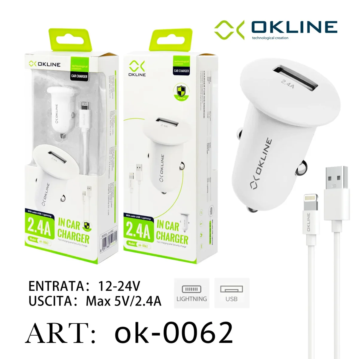 **ART.OK-0062 OKLINE USB Caricatore Auto 2.4A Con Iphone Lightning USB Cavo Bianco GTIN 8057760590625