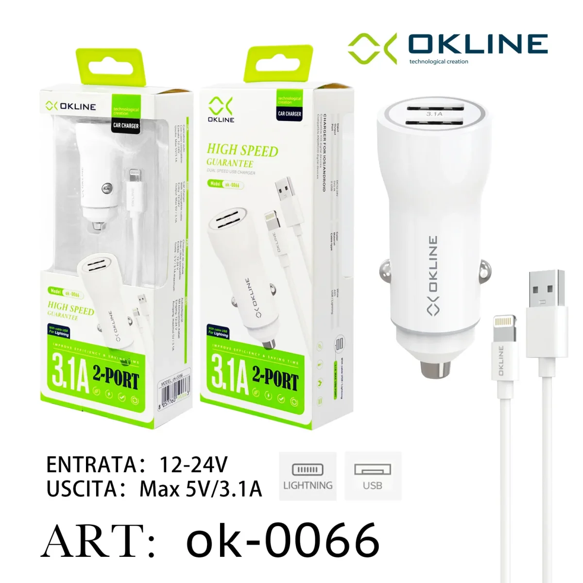 **ART.OK-0066 OKLINE USB Caricatore Auto 3.1A Con Iphone Lightning USB Cavo Bianco EAN 8057760590663