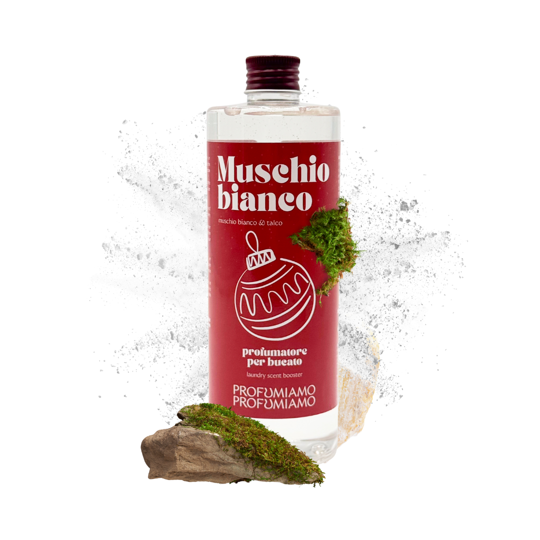 Il profumo per bucato Muschio Bianco di Profumiamo Profumiamo avvolge i tessuti in una sensazione di pulito profondo, morbido e rassicurante.