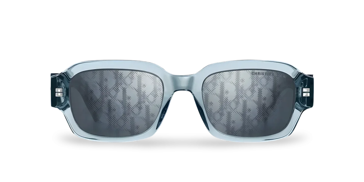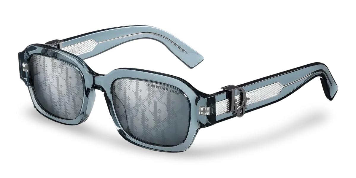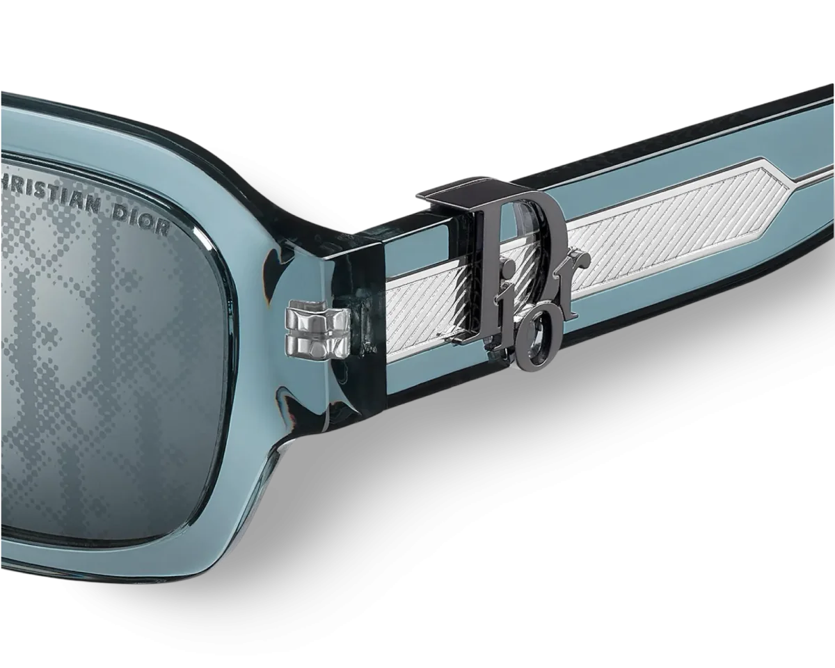 Questi occhiali da sole DiorOblique S2I presentano l’iconico logo Dior Oblique in metallo con finitura color rutenio. La montatura rettangolare in acetato blu trasparente è caratterizzata da un inserto in metallo con dettagli guilloché sulle aste. Le lenti specchiate blu-argento sono impreziosite dal motivo Dior Oblique pixellato e dalla firma Christian Dior sulla lente sinistra, a sottolineare l’aspetto informale del modello.