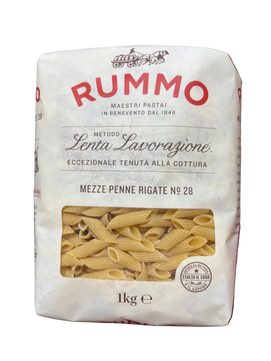 Le Mezze Penne Rigate Rummo N°28 da 1kg sono un formato corto e versatile, ideale per condimenti leggeri o cremosi. La superficie rigata e la struttura compatta aiutano a raccogliere bene il sugo.