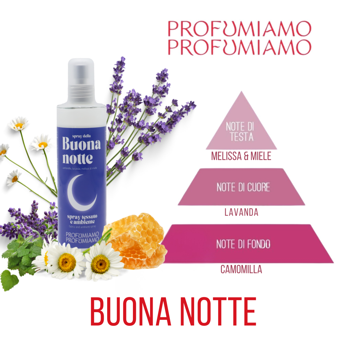 La combinazione di camomilla, melissa, lavanda e miele crea un’atmosfera rilassante e avvolgente, perfetta per concludere la giornata in totale tranquillità.