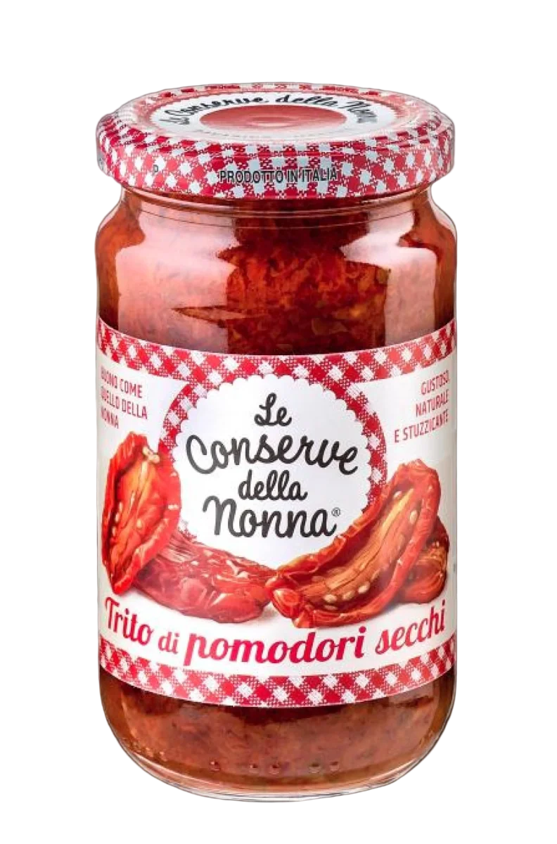 Il Trito di Pomodori Secchi Le Conserve della Nonna è una specialità italiana dal sapore intenso e autentico, preparata con pomodori secchi di alta qualità lavorati con cura e conditi con olio di semi di girasole, erbe aromatiche e spezie.